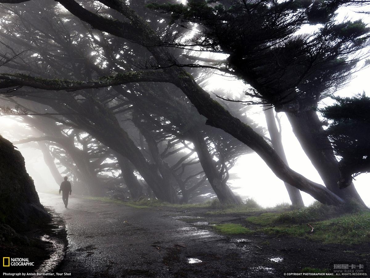 美国加利福尼亚州的雷斯岬靠近悬崖之顶,被浓雾所笼罩。古树在大风吹拂之下倒向一侧,形成了奇特的隧道,太阳穿透了层层浓雾,有限的能见度令人感受到非常奇特的效果,看起来亦真亦幻。偶尔,觉得有点阴森森的,特别是四周很少有人。