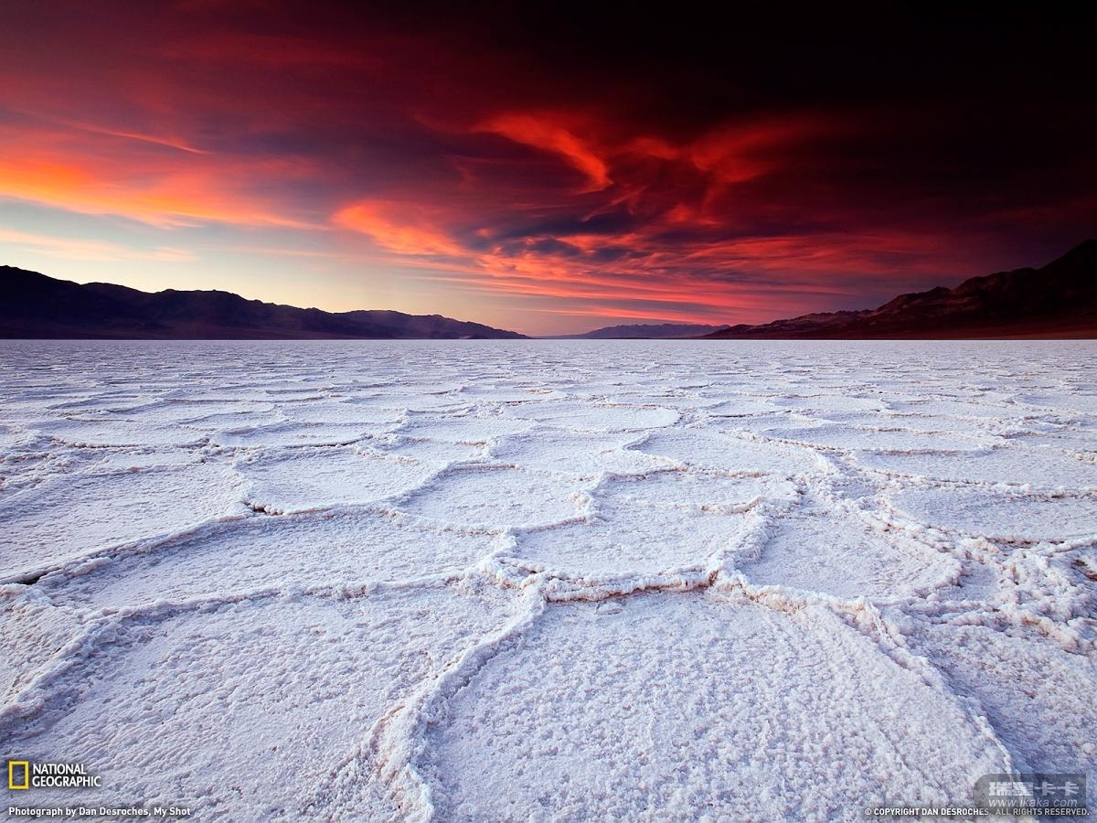 这张照片拍摄于死亡谷一处名叫恶水盆地的地方——一片低于海平面的盐碱地。