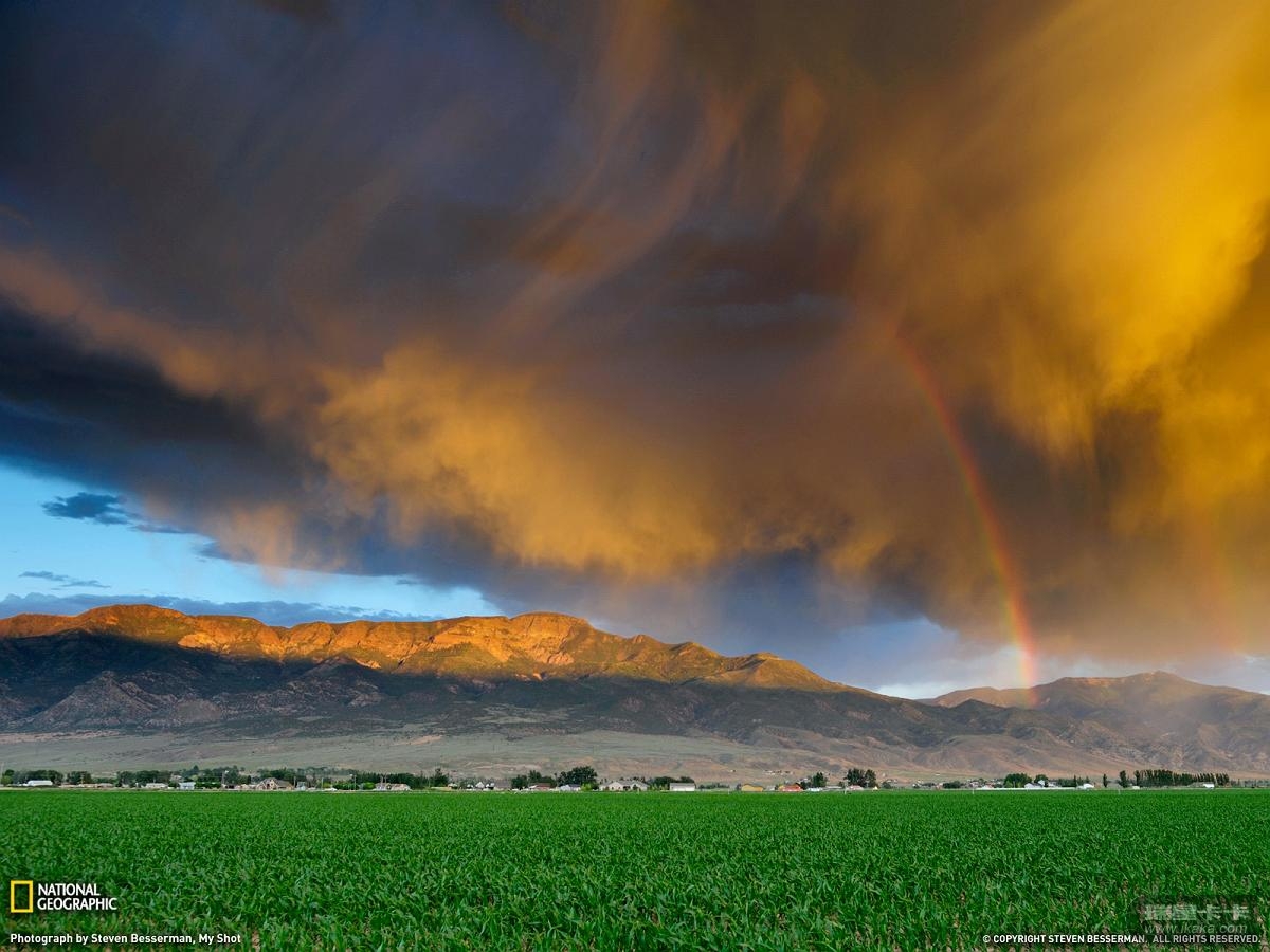 伴随日落时的余晖,乌云从美国犹他州的玉米地上空经过。