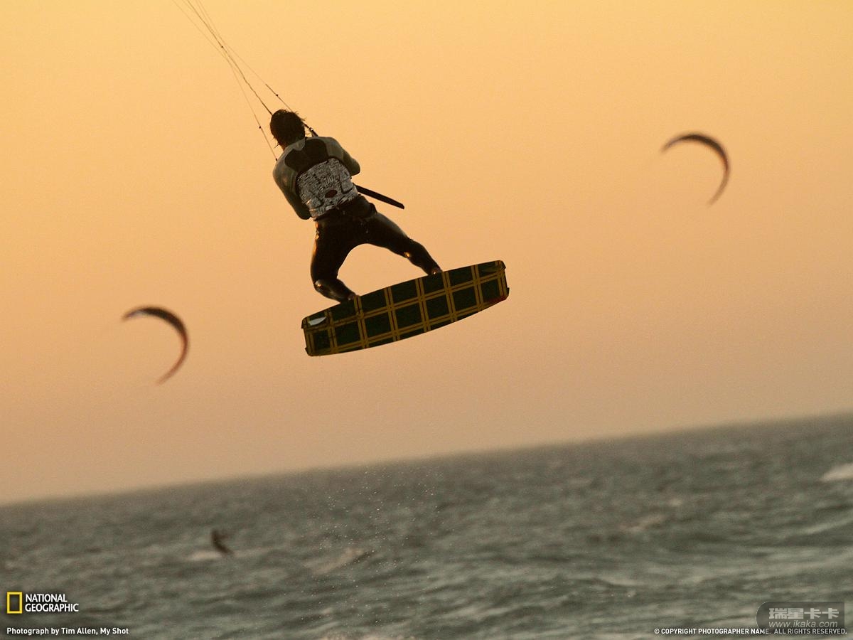 在南非开普敦的塔布尔维(Table View),风筝冲浪者乘风跃起。