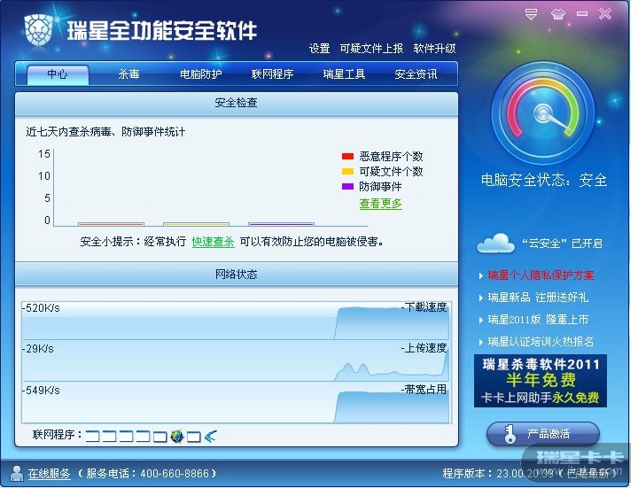 然后把瑞星升级到2011版,下载同样的文件,下载完屏幕出现瑞星主界面没有任何提示