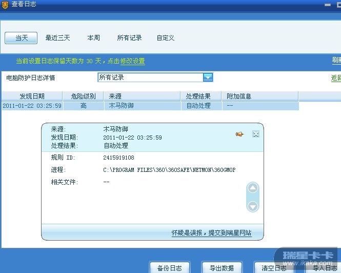 右击瑞星监控>>查看日志>>备份日志,将导出的db文件上传。