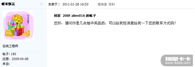 请问你是几点抽中奖品的,方便将你的联系方式站内短信发我吗?