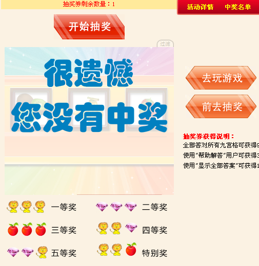 参加九宫格数独游戏就能够获得抽奖券,点击抽奖按钮就可以参加此次的活动(注:此次活动将以老虎机的形式进行抽奖)。凡是参加活动的用户就有机会获得Pangoo Zero系列 分体电视听吧、IPhone4 联通3G手机、IBM 移动硬盘—瑞星专版(250GB)、瑞星8GU盘、瑞星全功能2011安全软件、瑞星卡卡毛绒公仔等奖品,机会多多奖品多多快来参加吧!