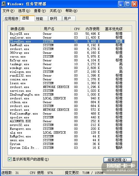 刚关了云安全。。。就很卡。。。马上看见了Cloudsys.exe这个进程了。。。但很快又消失了。。。3楼。。23.00.20.72貌似就是最新版吧?2011-02-17 11:14更新的