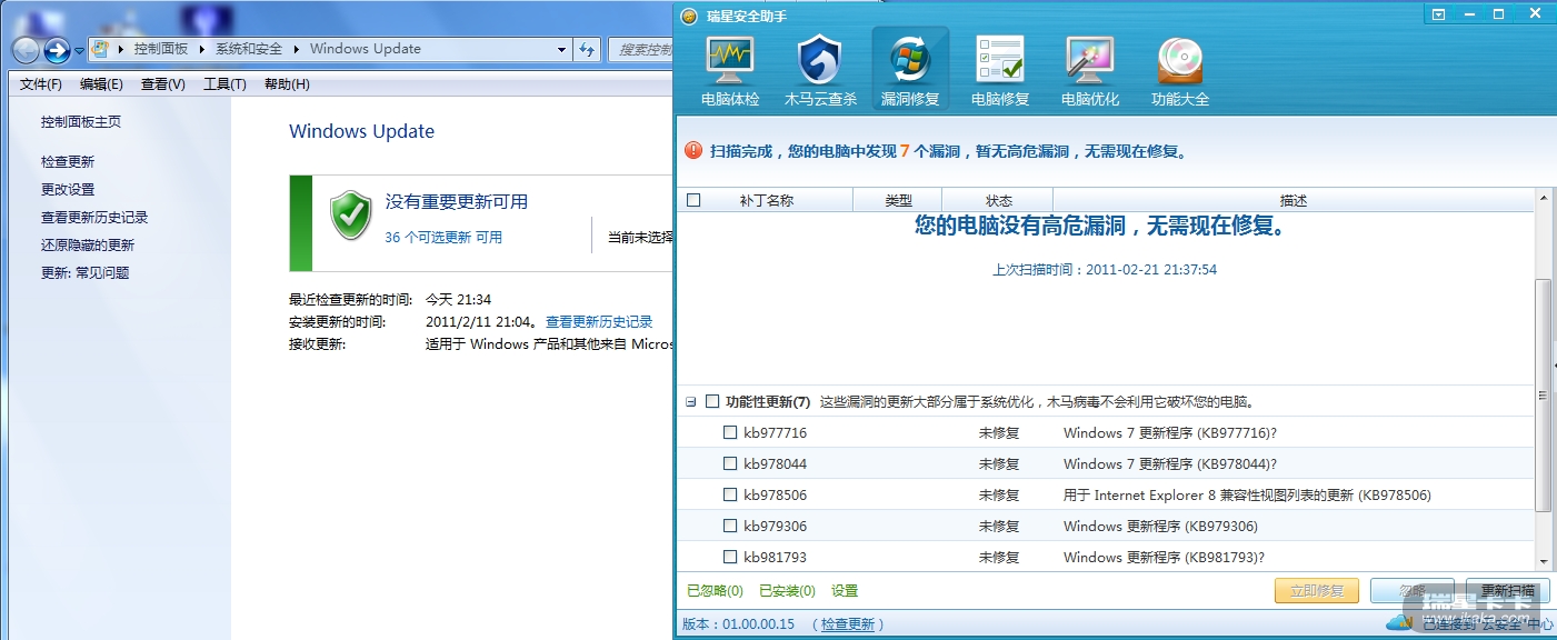 根据lz提供截图,瑞星安全助手发现的是功能性更新而不是系统的漏洞,有时Windows Update 不会及时要求用户安装功能性更新。lz瑞星安全助手能否将扫描到的漏洞成功修复:kaka2: