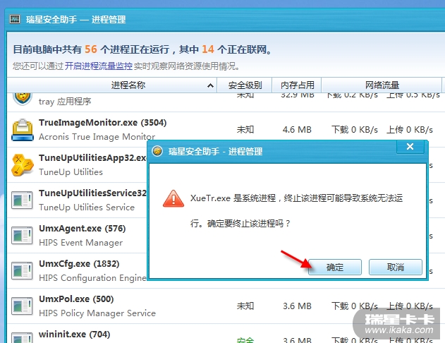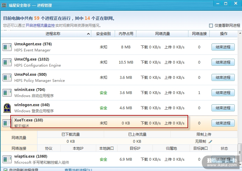 对于那些加载过驱动的进程(本例是XueTr.exe),瑞星助手无法终止。