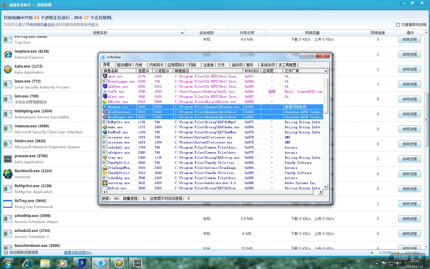 结果令人失望:用瑞星助手一一结束“av专用播放器”相关的木马+流氓进程,瑞星助手“进程管理窗口”也显示这些进程被结束了(大图);好!用XueTr看看——木马+流氓进xxx的结束了吗?并未结束(小图蓝色高亮显示)。汗!