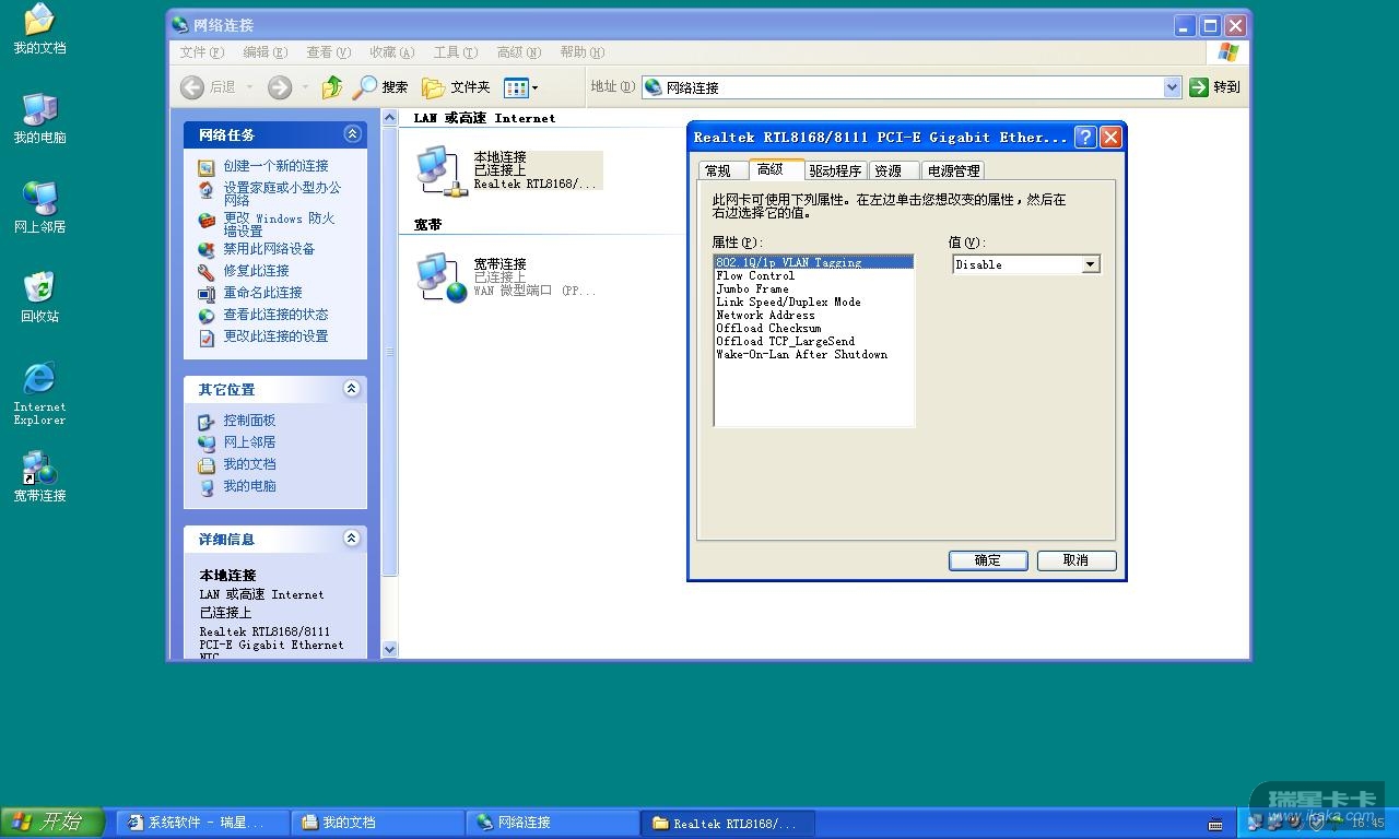 在网上看了一系统优化文章,根据其中把网卡中“link speed/duplex mode” 里的值改成了“10mbps/half duplex”,重新系统登陆宽带时出现诸如“加载通讯簿错误”之类的几个提示框~~~