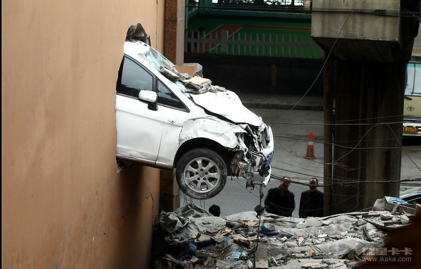 “是不是在拍电影哦?”黄小平惊魂未定。车头悬空的两个前轮还在转动。车头下方,是收购站仓库,还好车子被墙卡住没有掉下来。黄小平没看到司机,因为安全气囊已经打开,遮住了前挡风玻璃。稍后,黄小平看到悬空的车上下来一男一女,男的是司机。