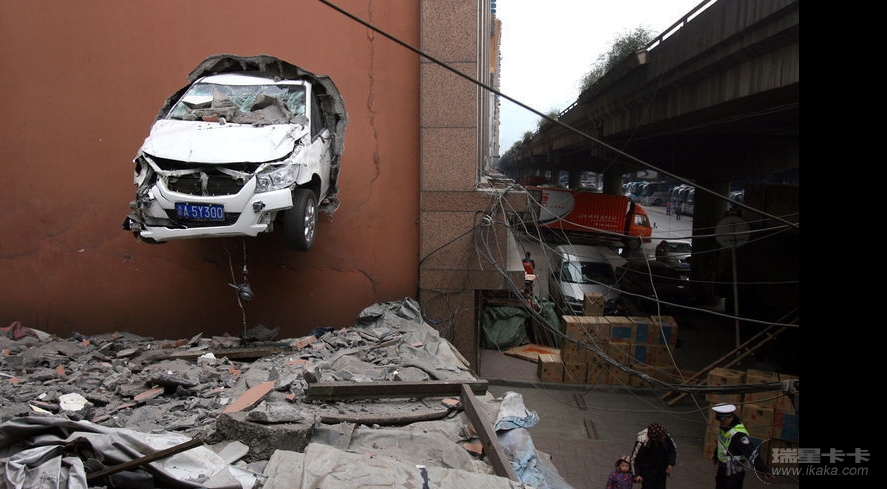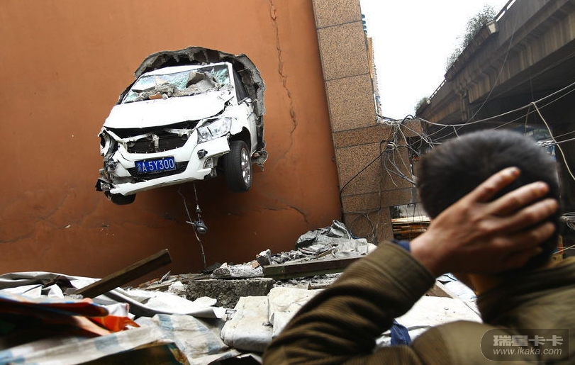 “轰隆!”昨日早晨8点刚过,重庆渝中区长滨路上传出一声巨响。紧邻南滨大厦的废品收购站老板黄小平伸出头探望,结果把瞌睡整醒了———离地3米多高处,一辆白色多用途轿车将南滨大厦侧墙撞出一个大洞,车头和前胎在外,车身半腰“镶嵌”在墙中间,犹如好莱坞大片里的特技镜头,“在拍戏?这也太真了吧!”