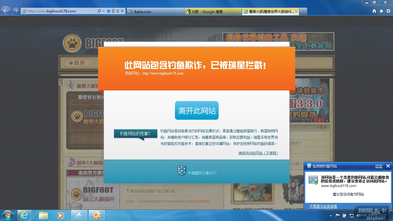 瑞星全功能安全软件2011不能正常拦截钓鱼网站