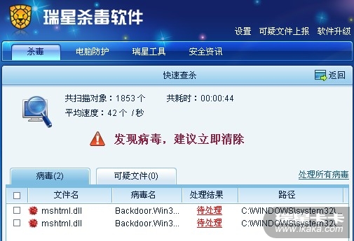 我的也是啊,今天就报mshtml.dll是病毒.昨天还没有.搞的我上网都无法上网.一键恢复后,还报这个是病毒.