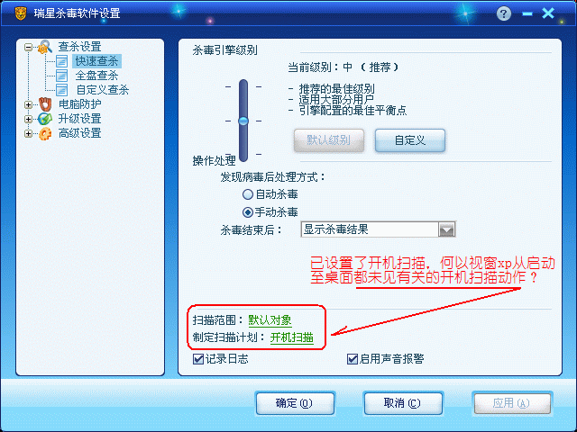 请问为什么要将 “文件监控” 关闭? 之前 Rav2010 里的 “开机查杀” 与 “文件监控” 并无冲突哦,何以 Rav2011 要使用 “开机查杀” 就需要将 “文件监控” 关闭?难道为执行 “开机查杀” 而每次都手动关闭 “文件监控” 待 “开机查杀” 完成后再手动重新开启 “文件监控” ?这也太麻烦了,还不如原来的 Rav2010 方便,一次设置即可。