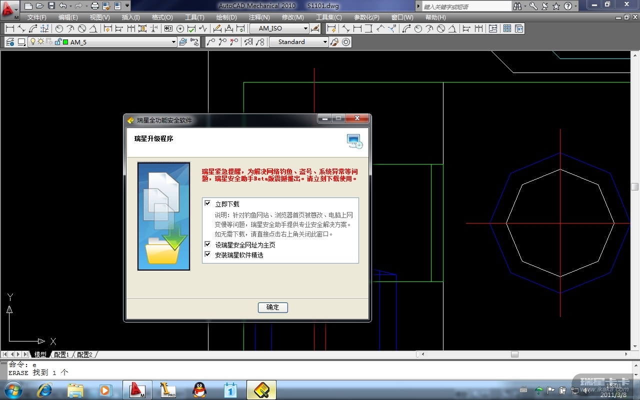 今天下午6点多的时候,正在起劲的画着图,突然蹦出下面的界面,吓我一跳,还以为中毒了呢!