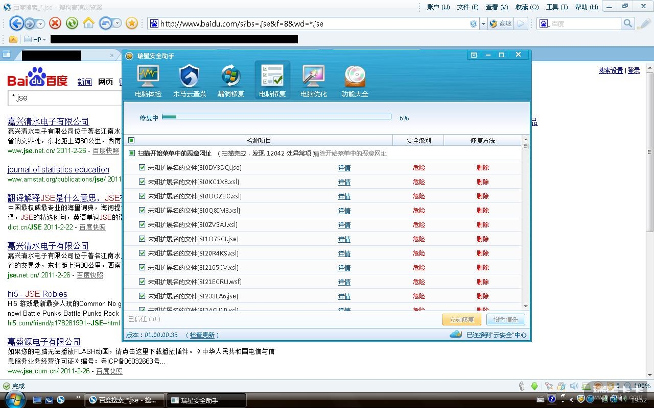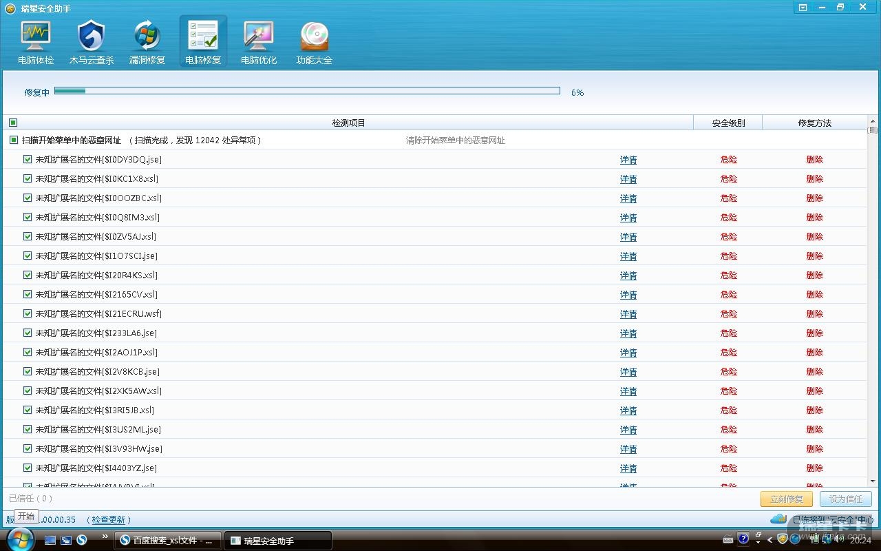 系统体检开始就助手运行就十分缓慢,40分钟后完成体检。显示12000多文件需要清理,单击立即清理安全助手15分钟停止响应。结束安全助手界面进程,重新运行助手。此时各项可正常使用。单击电脑修复标签开始扫描文件,30分钟后完成扫描。虽然感觉清理项不是必要,出于对瑞星的信任还是单击了清理选项。结果助手开始清理,10分钟后停在6%不动,一小时后依然如此。