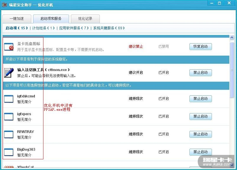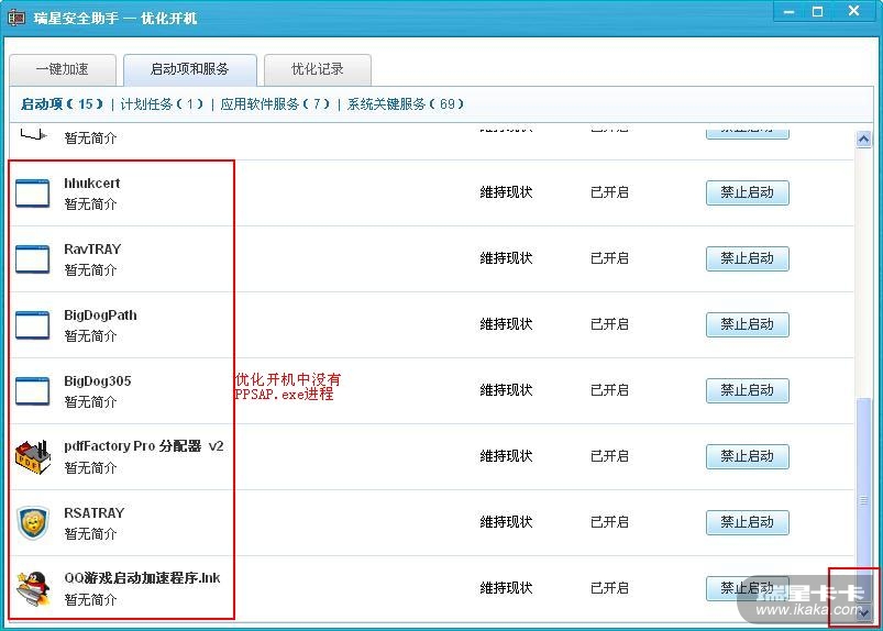 无论是“优化开机”的“启动项”、“计划任务”还是“应用软件服务”(以上三项有截图),还是已优化的项目(有截图),甚至是“系统关键服务”(未截图)都没找到PPSAP.exe。(注:在系统盘符下的确有PPSAP.exe文件的存在,而且瑞星流量监控也能监测到该程序,只是瑞星的启动项列表中找不到)