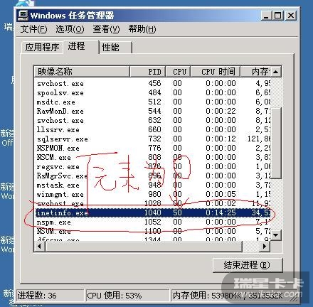 安装了瑞星全功能杀毒后,服务器中的inetinfo.exe进程占cpu为99%