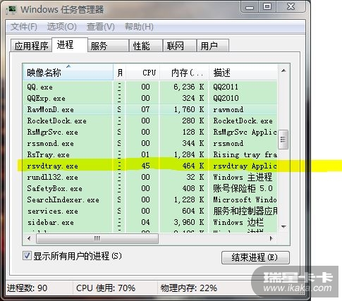 前些天电脑一直很好,昨天把瑞星卡卡删除了,换上了瑞星助手,换完之后重启,重启之后感觉电脑风扇转动的就特别频繁,曾经玩一两个小时,转不了10分钟,但是从昨天开始隔个两三分钟就疯转一会儿,我看了下进程,一个rsvdtray。exe的进程占cpu很高,基本上都是40%以上一般都是50%转悠,就是显示桌面,什么都不干CPU基本在60%转悠,曾经什么都不干CPU都很少超过10%,瑞星在哪里运算什么啊???