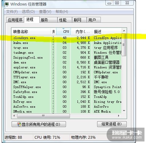 不是杀毒软件的事吧!我昨天之前没出现这样的情况,就从昨天把卡卡卸载了换上瑞星安全助手之后就这样,那个进程所在的文件是安全助手文件夹里的。