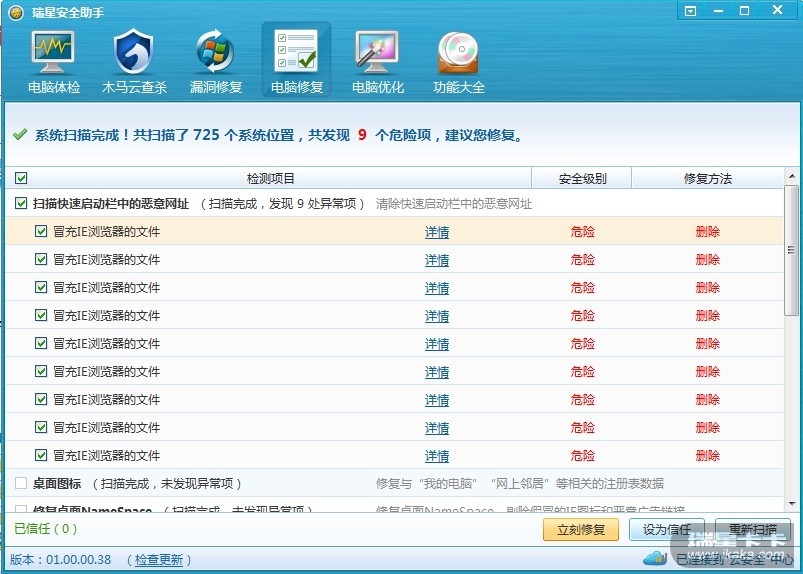 今天升级到了IE9正式版,发现瑞星安全助手不支持IE9的转到固定网站这项功能。我在任务栏收藏了几个常用网页,安全助手居然检测的是冒充IE浏览器文件- -!让我很是无语......安全助手快点更新吧。