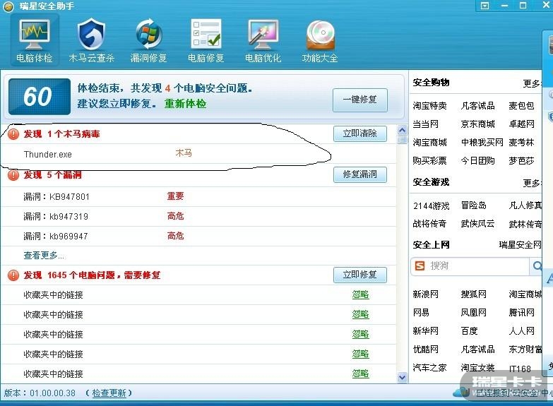 误把迅雷也删除了,xpsp3系统,浏览器ie8,搜狗。RSA : 01.00.00.38
