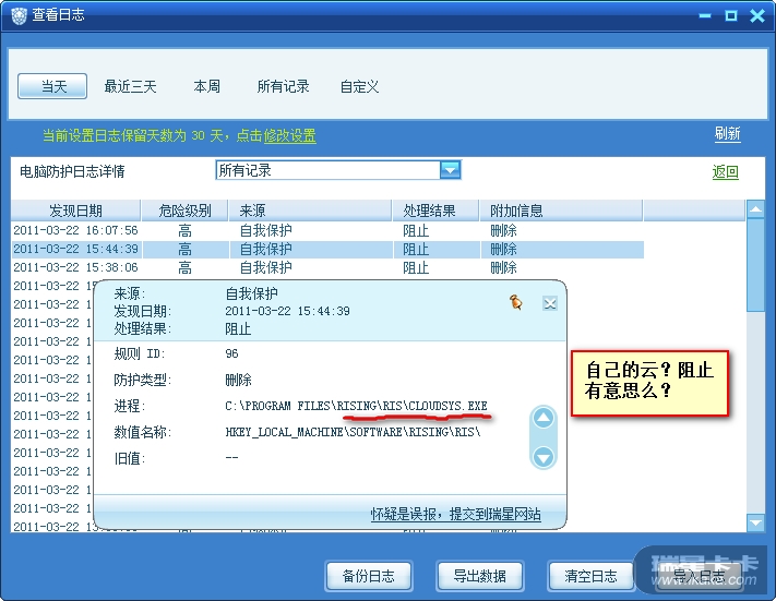 关于截图上的日志,我没有进行任何操作,瑞星也没有任何提示的状况下记录的,附上日志文件
