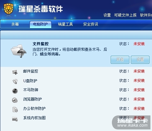 如题:新装瑞星杀毒为什麽电脑防护功能没有?各种监控防护等都显示为未安装。如图