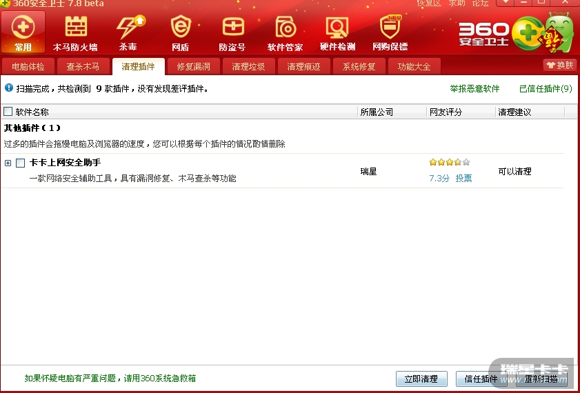 大家请看这是用360安全卫士清理插件,居然清理卡卡是插件?怎么办