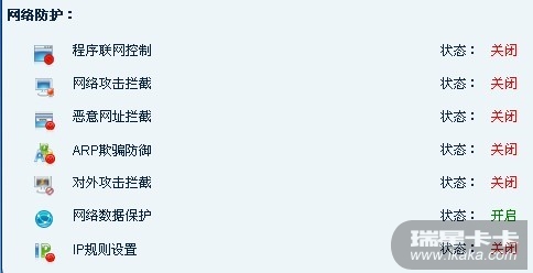 瑞星全功能版,软件有时升级后(包括静默和手动),“网络防护”中只剩“网络数据保护”一项是开启的,其余保护都自动关闭了。如附件中图片。