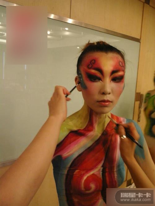 不过,也有些担心。看到化妆师们拿着一管管的颜料,因为学画,所以我也懂得原料和京剧上使用的原料是一样的。化妆师不仅要在我的身体上画,还需要在我的脸上也画上图案。颜料留在皮肤上有点痒痒的,又不能抓挠,的确很遭罪。