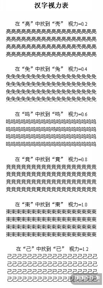 一张“围脖体”汉字视力表,总限时一分钟,每栏限时10秒。如果测得的视力在0.6以下,表示你该休息了。