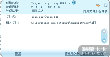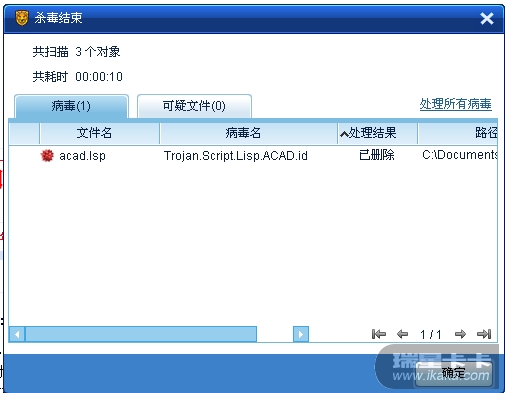 RT,我公司的一台共享机上装的是瑞星杀毒软件,更新最新病毒库后全盘查杀后没有病毒,但别的机子查这台机子里有大量的acad.lsp文件有病毒。于是我提交了一个到可疑文件上报。得到如下结果: