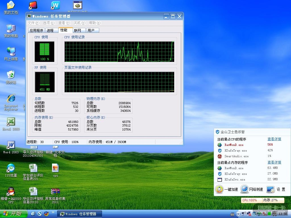 另外几次开机看了下,机器中装有金山卫士,可以通过他的悬浮窗发现,每次开机后什么也不做,看什么程序最占cpu,几次都是开机后一切正常,等一会儿瑞星的ravmond.exe,cpu占用很高,持续了约30、40秒的时间,恢复正常,每次都是。这时如果在打开其它程序的话,一定会很卡。这现象正常吗?