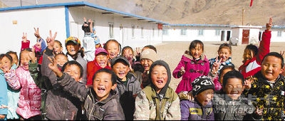 4月11日,玉树藏族自治州红旗小学的孩子们在镜头前欢呼雀跃。该校有23个班,1100名学生,日常教学一切正常,正在建设的新校园将在下学期投入使用。