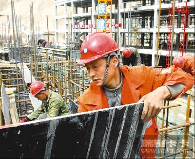 4月11日,中国铁建的工人们在援建玉树藏族自治州民族中学。