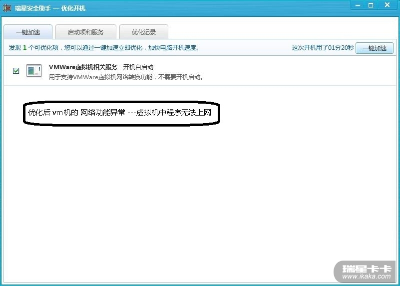结果:助手报错和 开机优化后 ,vm虚拟机中xp 下的程序无法上网