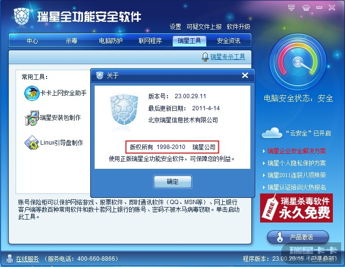 说明:版权所有这里为什么显示1998-2010瑞星公司的字样。
