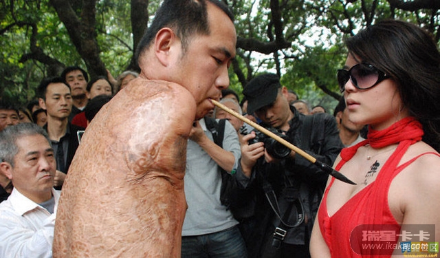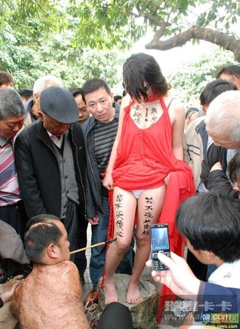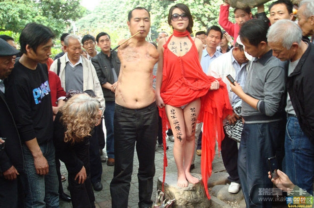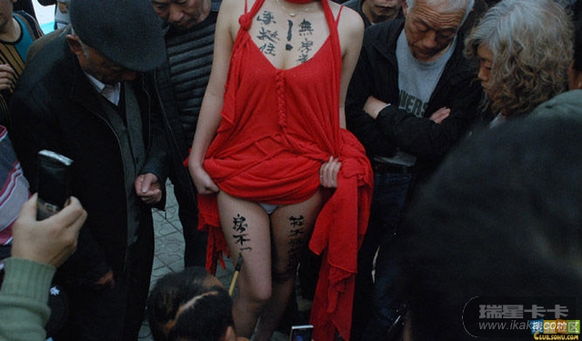 更雷人的是,她特请来一位山东籍80后无臂书法家用嘴在其裸露的玉体上书写标语——其xxx处写的是“无房者,要挺住!”;两条大腿前面分别写着“花不浇必自枯”、 “房不买价必降”;大裸背上写的则是“哥写的不是字,是斗志!”