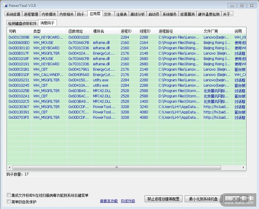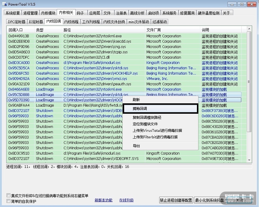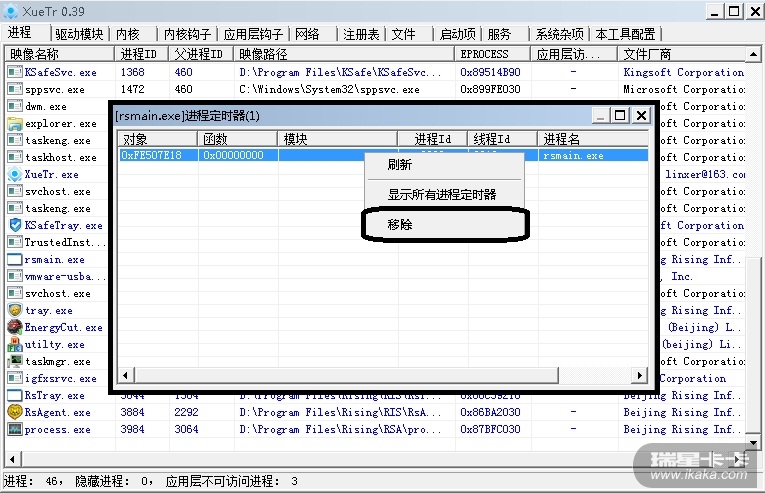 此软件能移除瑞星钩子 , 选中进程 -----查看 ---进程定时器 ,进行操作