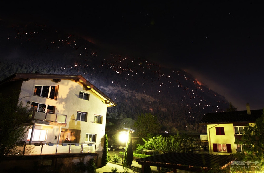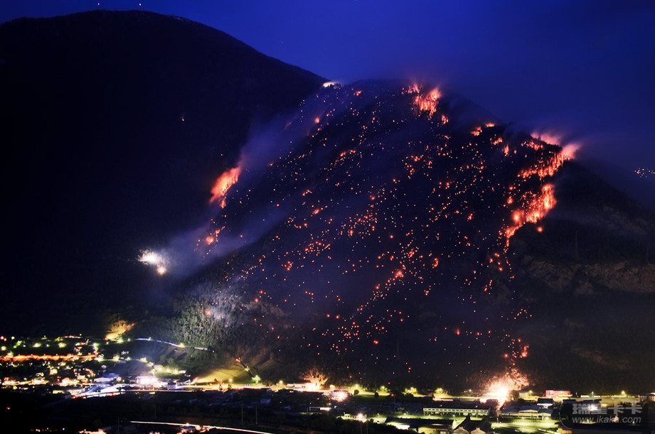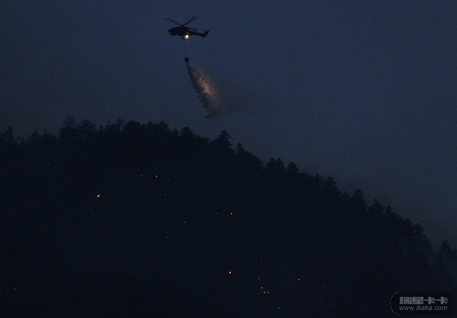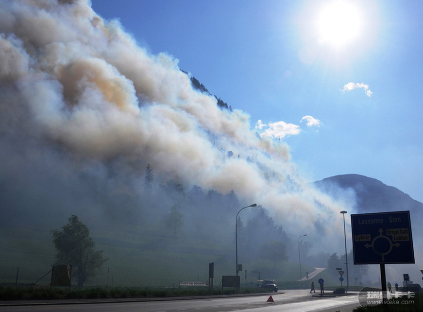 瑞士发生森林火灾 过火面积达数百公顷报道说,火灾由维耶日附近一家汽车修理店引起。由于持续干旱,当天又刮起大风,火势迅速蔓延,附近山坡上森林燃起大火。险峻的山势阻碍了消防队员灭火,10架直升机轮番洒水救火,直至当晚9时因天黑才停止飞行。消防队员继续扑救,瑞士军队也出动了120名军人增援。