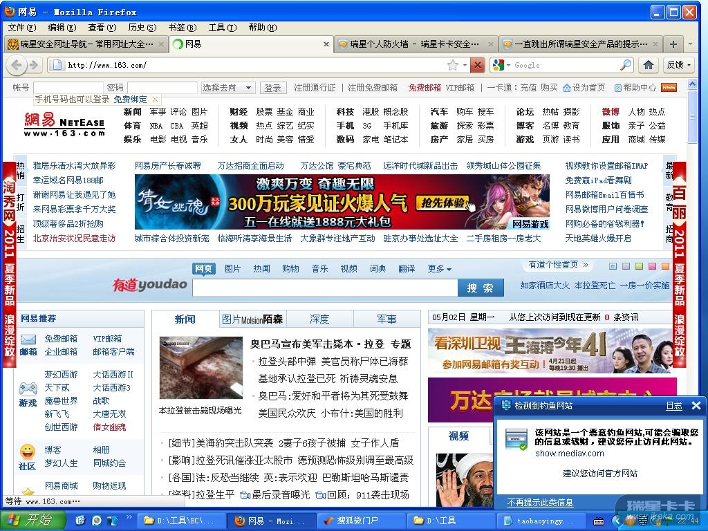 我现在都用瑞星安全网址导航打开网站,目前网易打开就提示发现钓鱼网站,新浪和搜狐是点开部分新闻就跳出提示,天涯也是如此,我用瑞星全面杀毒,同时也用卡卡扫描了,都没发现电脑有病毒和木马。版本号23.00.19.23