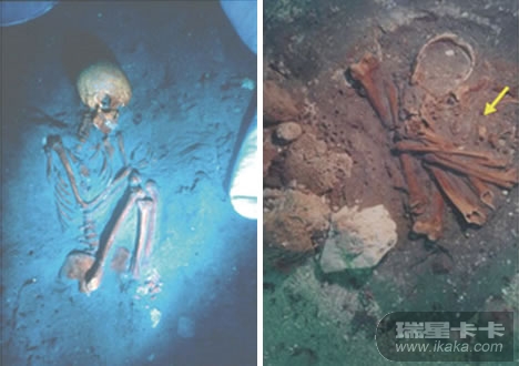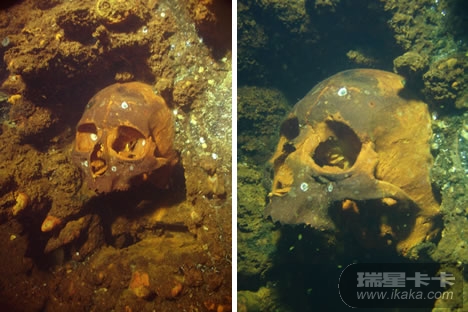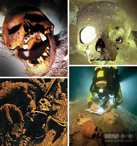 左上图中这个恐怖的骷髅头是海底考古学家在墨西哥附近海域,发现的被玛雅人当做祭品处死的人类遗骸,与它一起被发现的还有另外18具人类骸骨。左下角这张图片中,一具几乎完整的人类尸骨被发现躺在一艘沉船船头附近的锚上。这艘船是La Belle号,于1686年在得克萨斯州附近海域沉没。右下角是一具在墨西哥海底洞穴中发现的女性骷髅,她生活在距今1.36万年前,是在美洲发现的年代最为久远的人类尸骨