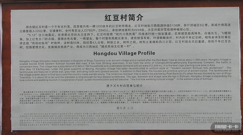 该村是汶川5.12大地震后由北京援助建设的。村内有棵千年红豆树,村名由此而来。具体情况请看下面的简介照片。今年5月8日,温家宝总理曾来这里视察。