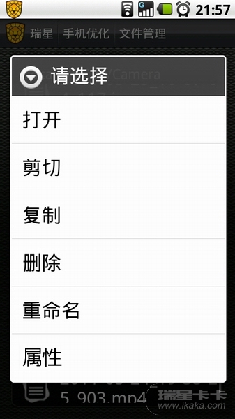 手机型号:摩托罗拉 XT806 操作系统版本:Android 2.1 瑞星软件版本:v1.00 Beta 3 涉及的其它软件版本:Beta 2 问题现象:文件管理打开后对文件的操作可以将“返回”改为“属性”,在安卓手机都有返回键,所以加上“属性”更方便查看文件的详细信息。 出现问题前的操作步骤:手机优化——文件管理