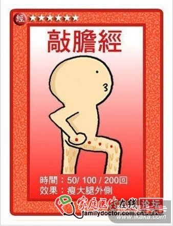 小S说,由于敲胆经可以使胆经的活动加速,将大腿外侧堆积在胆经上的垃圾排出,因此,这个运动直接就会使臀部和大腿外侧的脂肪减少,大约一至二个月就会感觉裤管变大了。