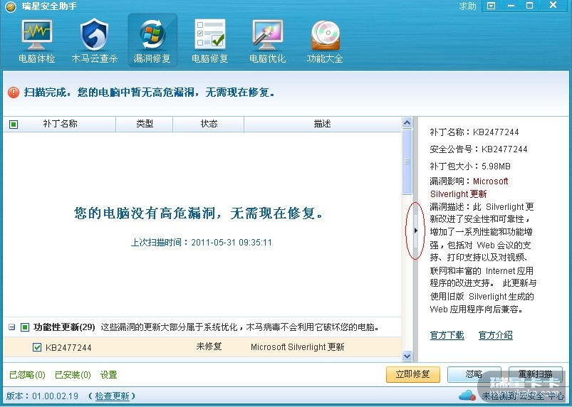 使用瑞星许多许多年了,卡卡也一直在用,直到安全助手的出现,希望安全助手在漏洞下载说明界面,也能象卡卡一样可以看到详细的漏洞功能介绍,这样便于客户选择是否安装,这个介绍很重要!!!安全助手的介绍太简单了,跟没说一样。如不改进会考虑其他产品。