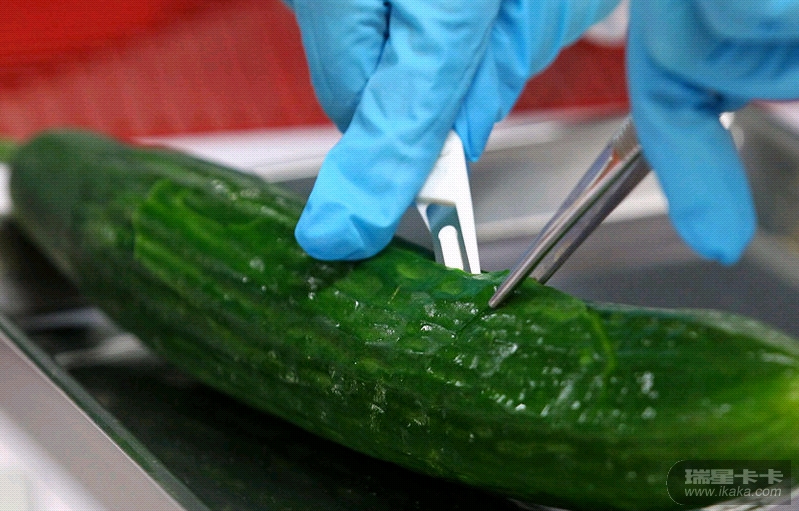 当地时间2011年5月30日,德国罗斯托尔市的农业与渔业食品安全办公室内,生物学家切开一直小黄瓜。德国因食用有毒黄瓜,感染出血性大肠杆菌而死亡的人数已升至14人,目前疫情仍在蔓延