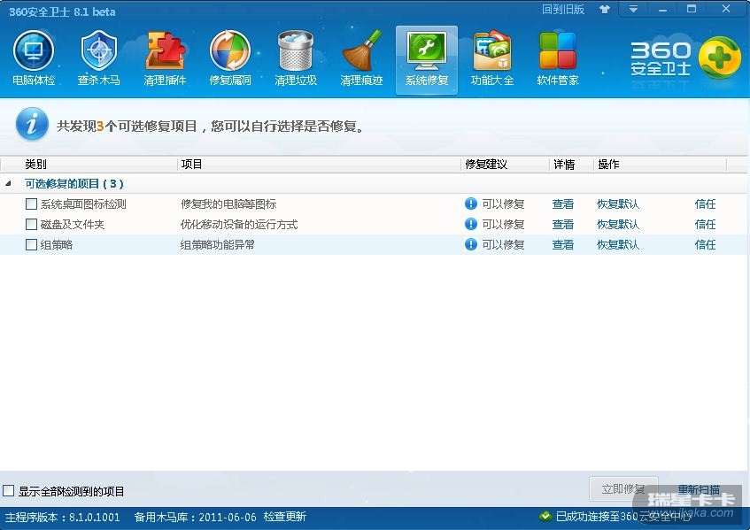 建议瑞星 工程师 测试 ,改进瑞星助手 的 系统修复 功能