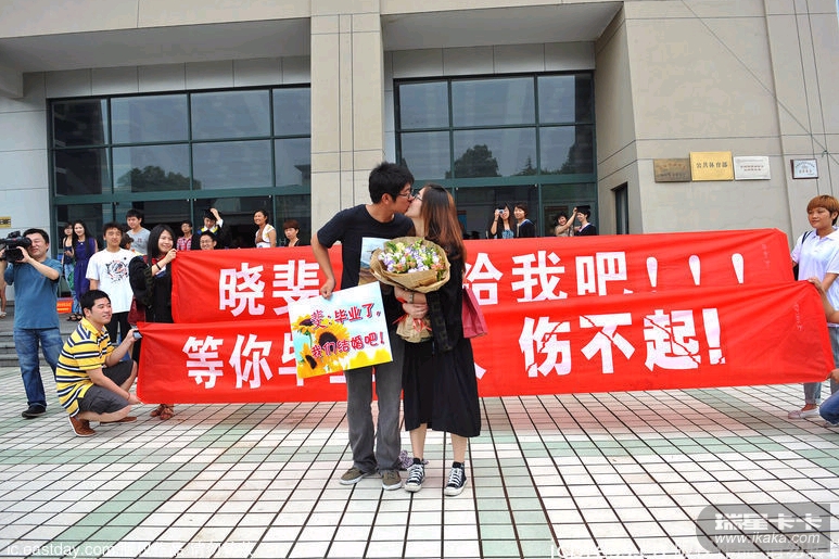 杭州市浙江传媒学院校园里,一幕浪漫的求婚记正在上演。青年男子黄佳健带上鲜花、“心声牌”以及亲友团,早早地等候在毕业典礼的会场外。当刚参加完毕业典礼的女朋友出现时,黄佳健勇敢地单膝下跪,表达爱意:“晓婓,嫁给我吧!”现场一片欢呼和祝福声。求婚男子黄佳健也是该校前两届的毕业生,他们在校园相恋,今天毕业了,他们也迎来了人生中最幸福浪漫的一刻。